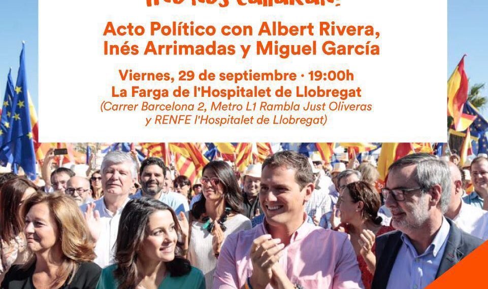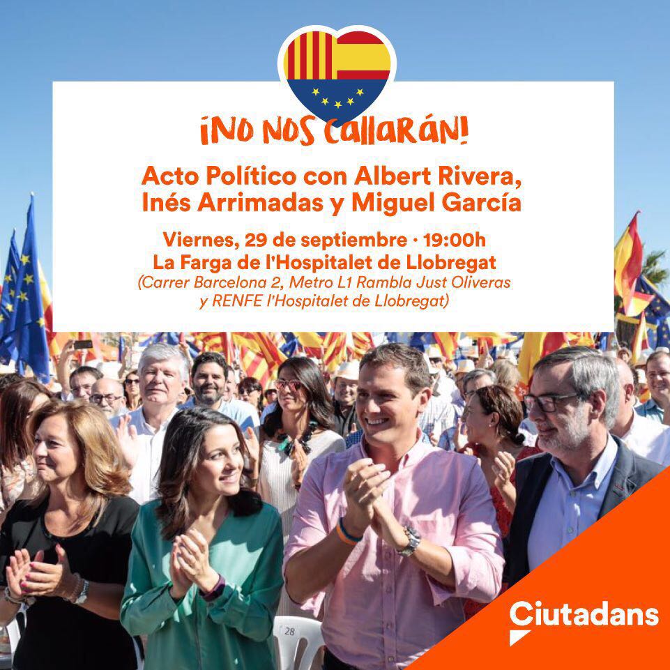 Ciudadanos organizará un acto el próximo viernes 29 de septiembre en L’Hospitalet bajo el lema «No nos callarán» al que asistirán Albert Rivera, Inés Arrimadas y el jefe de filas de la formación naranja en el consistorio de esta localidad, Miguel García. Comenzará a las 19:00 y el lugar escogido es La Farga (c/Barcelona, 2).