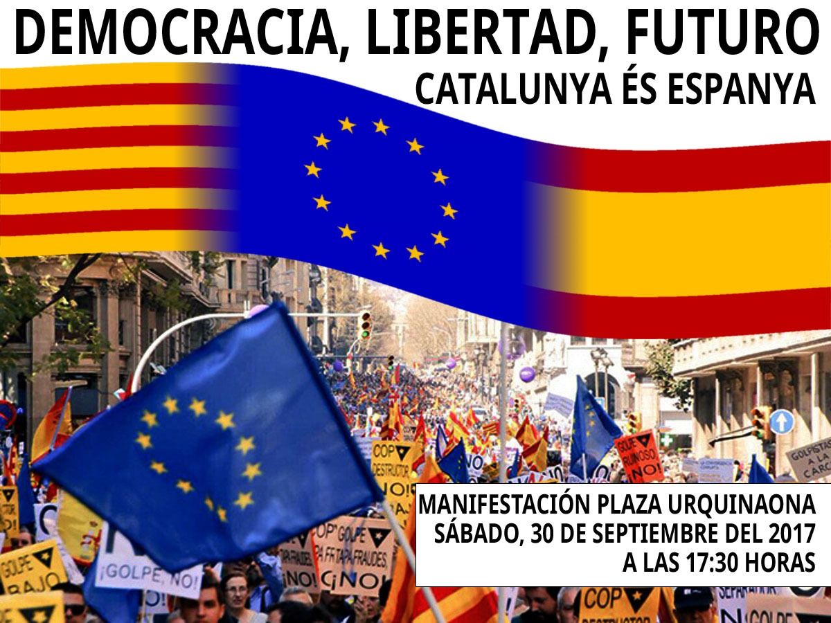 Cincuenta y dos asociaciones catalanas, entre ellas el Movimiento Cívico d’Espanya i Catalans, han convocado una manifestación en Barcelona con el lema «Democracia, libertad, futuro. Catalunya es España» el próximo sábado 30 de septiembre. La marcha partirá a las 17:30 h de Plaza Urquinaona hacia la Plaça de Sant Jaume.