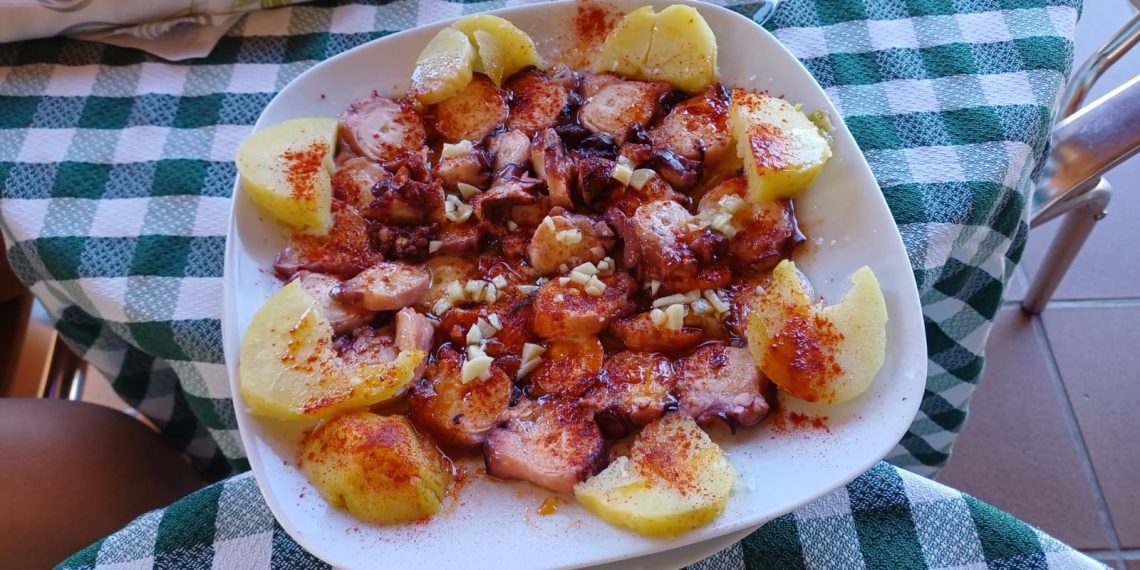 El pulpo es el típico a la gallega, con el añadido del ajo, lo que a mí me entusiasmó. Pocas patatas para mi gusto, pero muy sabroso y no dejamos ni asomo del aceite a base de mojar pan. Por cierto, también muy bueno. La chuleta a la brasa también muy rica y el estofado de ternera muy sabroso, con una salsa muy contundente y que invita a rapiñarla con media hogaza.
