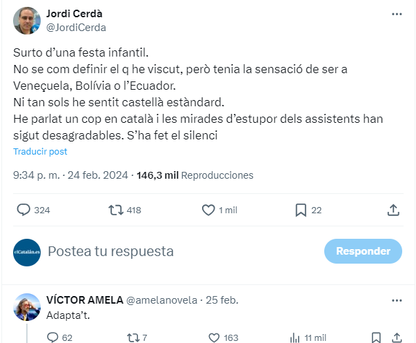 Resulta cuanto menos sorprendente que en pleno siglo XXI haya personas que sean capaces de escribir tales barbaridades y aún más se acaben sorprendiendo de que la gente se escandalice. El periodista y escritor Víctor Amela le ha lanzado un mensaje muy preciso y contundente a Cerdà, que se ha mostrado escandalizado porque en una fiesta infantil haya niños hispanos. «Adáptate«, le ha espetado Amela en la red social X. Ante un mensaje, que como decíamos anteriormente, se ha hecho viral.