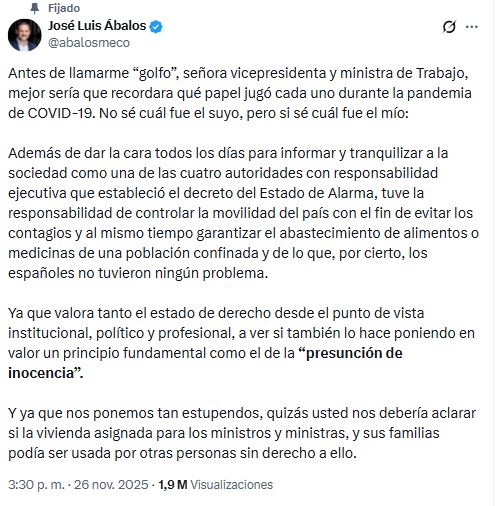 El exministro respondió a Díaz este miércoles insinuando que ella permite que «otras personas sin derecho a ello» utilicen su vivienda oficial, la que le corresponde por su cargo ministerial. A través de un mensaje en redes sociales dirigido a la «vicepresidenta y ministra de Trabajo», Ábalos la instó a recordar el «papel que jugó cada uno durante la pandemia» de COVID-19, afirmando conocer el suyo, pero poniendo en duda el de Díaz.