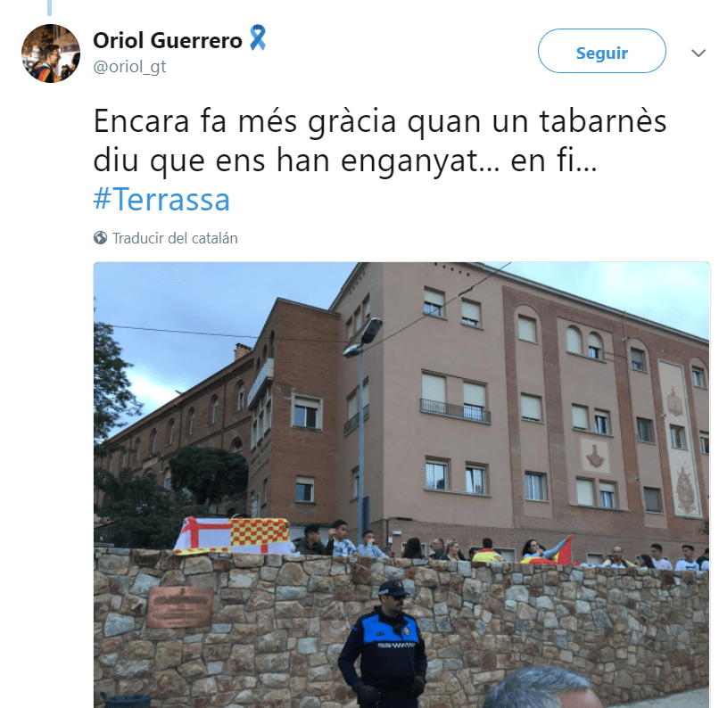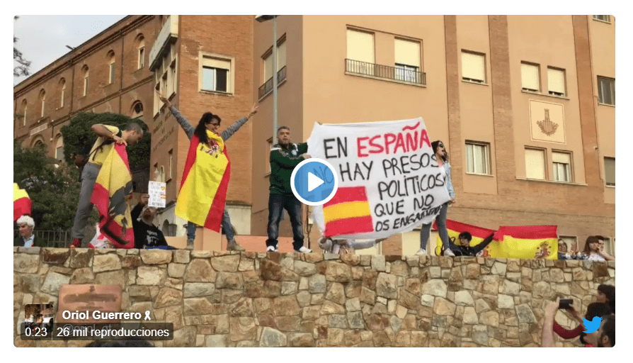 En el perfil personal de Twitter de Oriol Guerrero, activista independentista, se puede ver un vídeo en el que se ve a un grupo de constitucionalistas mostrar banderas rojigualdas ante una concentración separatista.