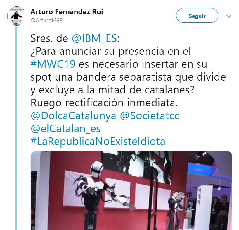 Mi nombre es xxx y quiero mostrar mi indignación al ver cómo la empresa IBM en su vídeo promocional para el Mobile World Congress 19 (Barcelona) muestra en el segundo 3 una bandera estelada, bandera que es símbolo de exclusión, división y enfrentamiento entre los catalanes.