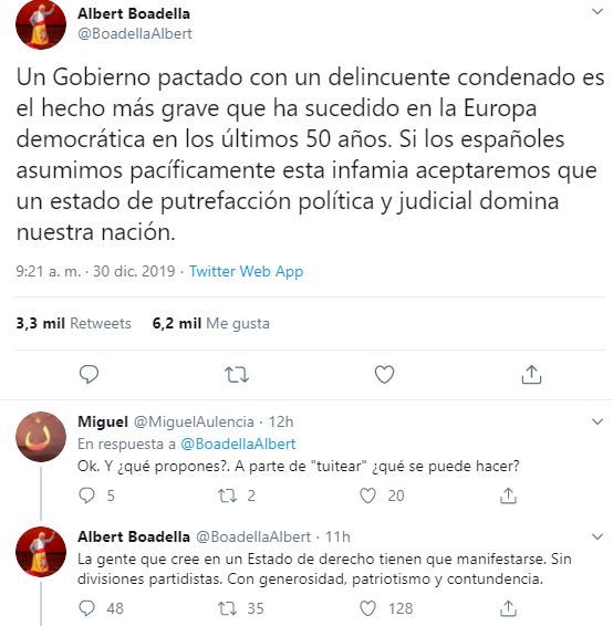 Boadella ha afirmado que «un Gobierno pactado con un delincuente condenado es el hecho más grave que ha sucedido en la Europa democrática en los últimos 50 años. Si los españoles asumimos pacíficamente esta infamia aceptaremos que un estado de putrefacción política y judicial domina nuestra nación».