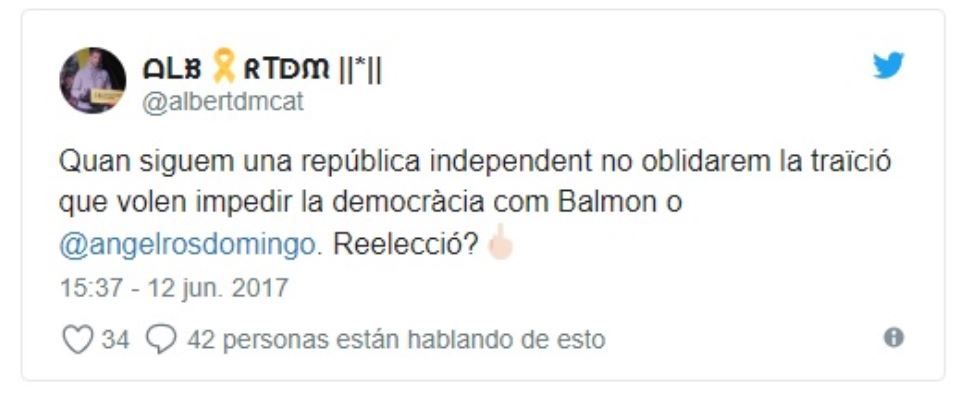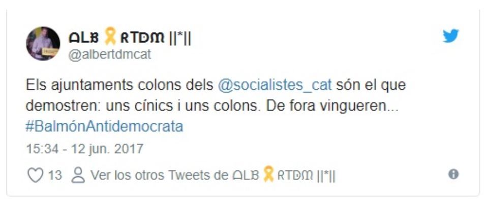 Uno de sus objetivos es el PSC. En 2017 escribió dos tuits contra los socialistas. En el primero decía que «cuando seamos una república independiente no olvidaremos la traición que quieren impedir la democracia como Balmon o Ángel Ros».