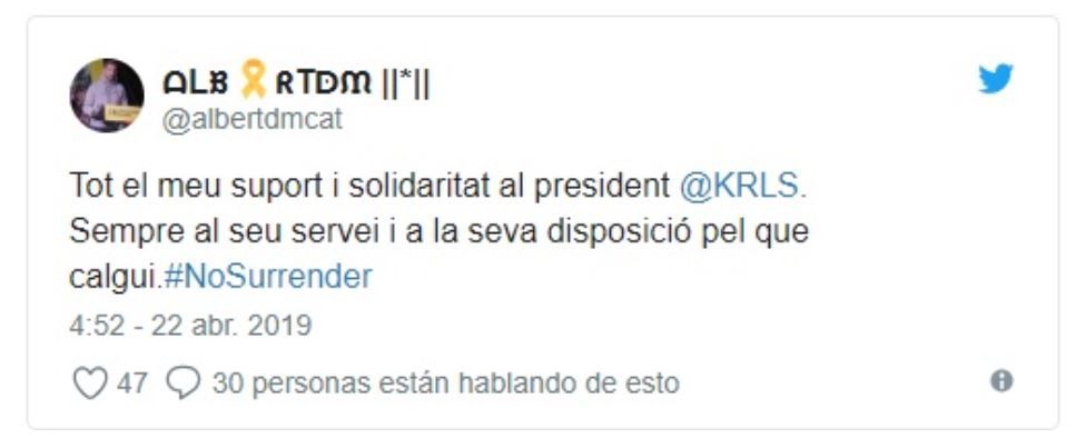 El pasado 22 de abril de 2019 este agente de la policía autonómica se puso al servicio de Carles Puigdemont «para lo que haga falta» tras la quema de un muñeco con la efigie del ex presidente de la Generalitat en la localidad sevillana de Coripe.