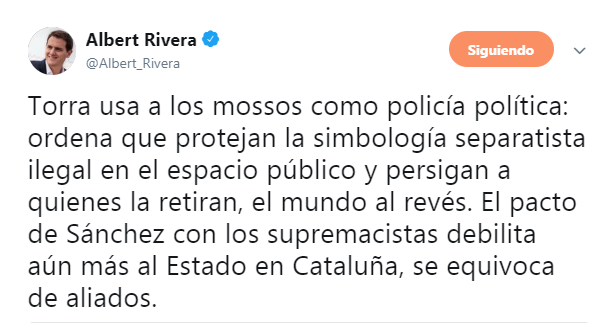 «El pacto de Sánchez con los supremacistas debilita aún más al estado en Cataluña, se equivoca de aliados», ha afirmado Rivera en su cuenta personal de Twitter.