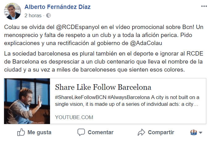 Alberto Fernández Díaz, presidente del Grupo del Partido Popular en el Ayuntamiento de Barcelona, ha denunciado en redes sociales que la alcaldesa de Barcelona, Ada Colau, se «olvida» del RCD Espanyol en un vídeo promocional sobre Barcelona.