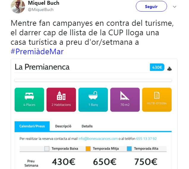 El semanario El Triangle ha recogido una denuncia en las redes sociales de Miquel Buch, alcalde de Premià de Mar por el PDeCAT, en la que asegura que Joan Ribet, ex regidor de la CUP, alquila a turistas su apartamento en la población. Estos precios son inasequibles para un ciudadano que cobre un sueldo medio y quiera residir habitualmente. El edil convergente ha asegurado en twitter que «mientras hacen campañas en contra del turismo, el último cabeza de lista de la CUP alquila una casa turística a precio de oro/semana en Premià de Mar».