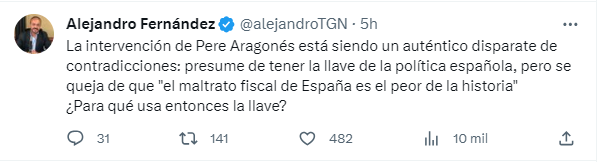 La intervención de Aragonès ha sido comentada en X por el presidente del Partido Popular catalán, Alejandro Fernández, quien ha propinado un soberano zasca al presidente de la Generalitat y ha dejado al descubierto las contradicciones de su discurso. «La intervención de Pere Aragonés está siendo un auténtico disparate de contradicciones: presume de tener la llave de la política española, pero se queja de que «el maltrato fiscal de España es el peor de la historia». ¿Para qué usa entonces la llave?«, el ‘zasca’ todavía resuenas en las paredes del Parlament.