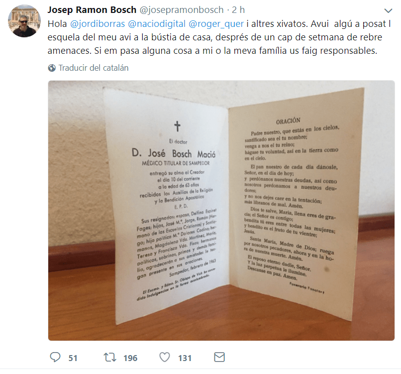 En esta ocasión la amenaza no ha sido nada sutil, dado que le han dejado en el buzón de su casa la esquela de su abuelo, Jordi Bosch Macià, que fue médico del mismo pueblo en el que actualmente reside, Santpedor (Barcelona).