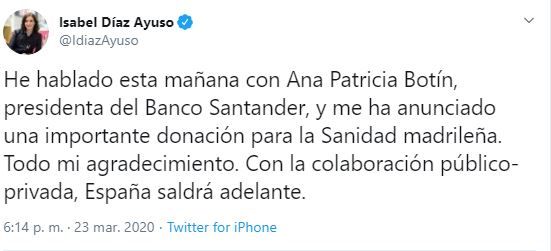 La presidenta de la Comunidad de Madrid, Isabel Díaz Ayuso ha difundido en su perfil personal en la red social Twitter que esta región será beneficiaria de una donación de la presidenta del Banco Santander, Ana Botín.