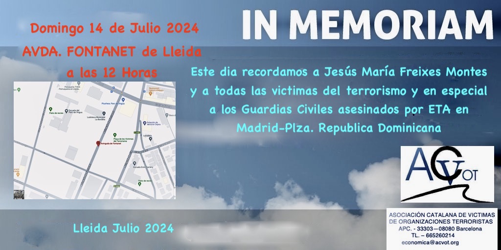 El homenaje se extiende a todos los guardias civiles que también fallecieron en este acto bárbaro y al resto de víctimas del terrorismo. Organiza la ACVOT. Se celebrará en Lérida, en la avenida Fontanet, a las 12:00. Jesús María Freixes era hermano de la prestigiosa jurista, y activista constitucionalista, Teresa Freixes, que intervendrá junto al presidente de la ACVOT, José Vargas.
