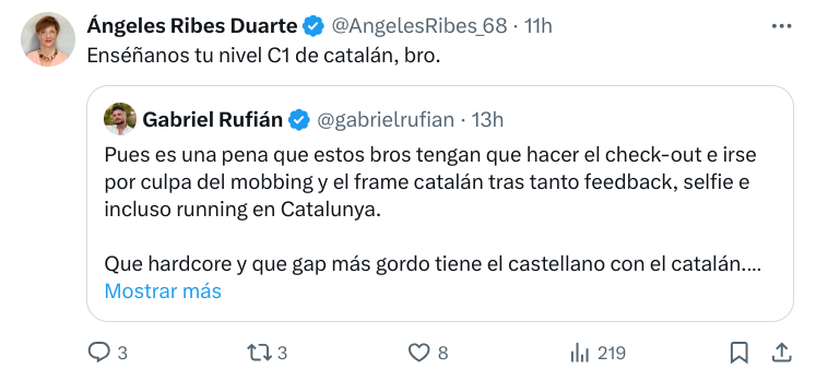 El portavoz de Esquerra en el Congreso de los Diputados ha recibido un importante ‘zasca’ en las redes sociales, algo que es muy habitual. En esta ocasión se lo ha propinado Ángeles Ribes, quien lo ha dejado ‘noqueado’ con una frase muy sencilla pero cargada de intención. “Enséñanos tu nivel C1 de catalán, bro”. Nada más que añadir.