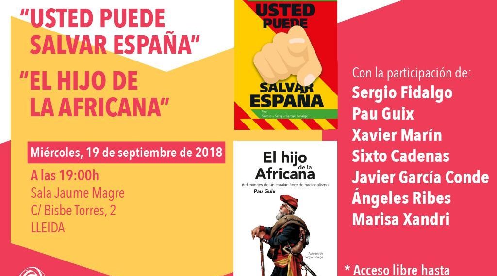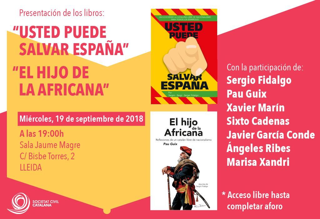 Societat Civil Catalana organiza el próximo miércoles 19 de septiembre, a las 19:00, la presentación de los libros ‘El hijo de la africana’, de Pau Guix, y ‘Usted puede salvar España’, de Sergio Fidalgo, en Lleida.