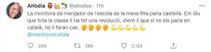«La monitora del comedor de la escuela de mi hija habla castellano. Me dice que toda la clase le ha hecho una revolución, diciéndole que si no les habla en catalán, no le harán caso. 🤭🤭🤭🤭 💪💪💪💪💪 @mantincelcatala», ha afirmado una independentista en Twitter, un mensaje que se ha hecho rápidamente viral entre las redes sociales separatistas.