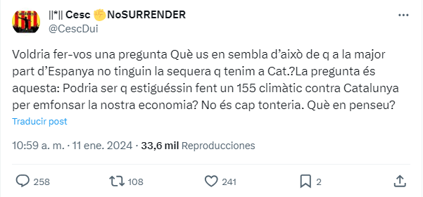 «Querría haceros una pregunta. ¿Qué os parece eso de que en la mayor parte de España no haya sequía que tenemos en Cataluña? La pregunta es esta: ¿Podría ser que estuvieran haciendo un 155 climático contra Cataluña para hundir nuestra economía? No es ninguna tontería. ¿Qué pensáis?, ha escrito una independentista en X.