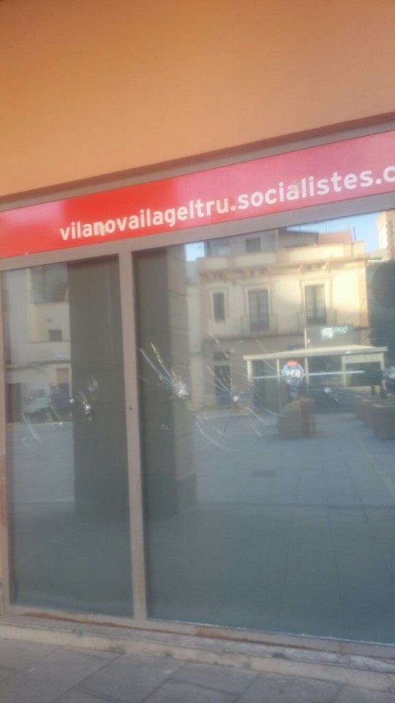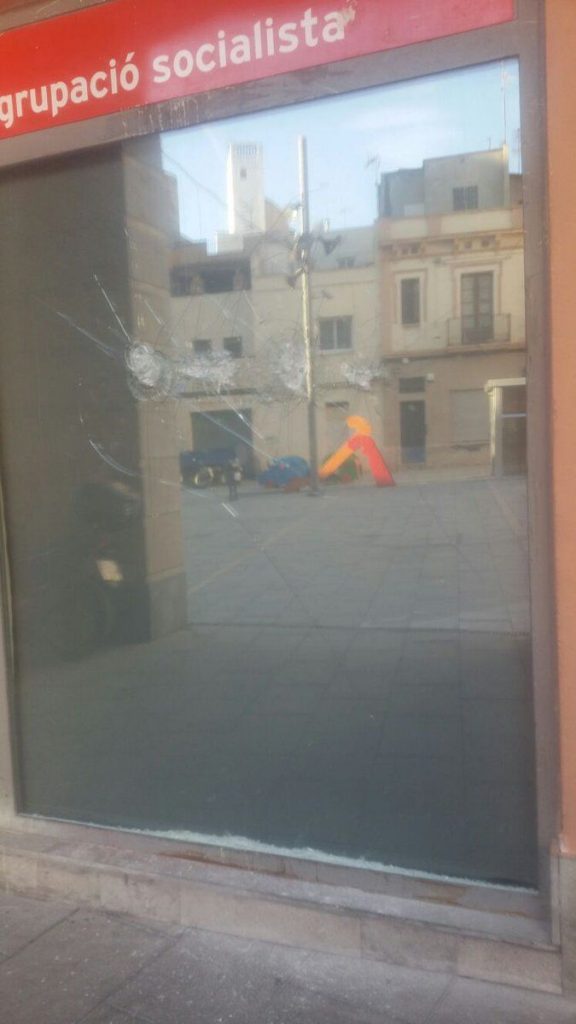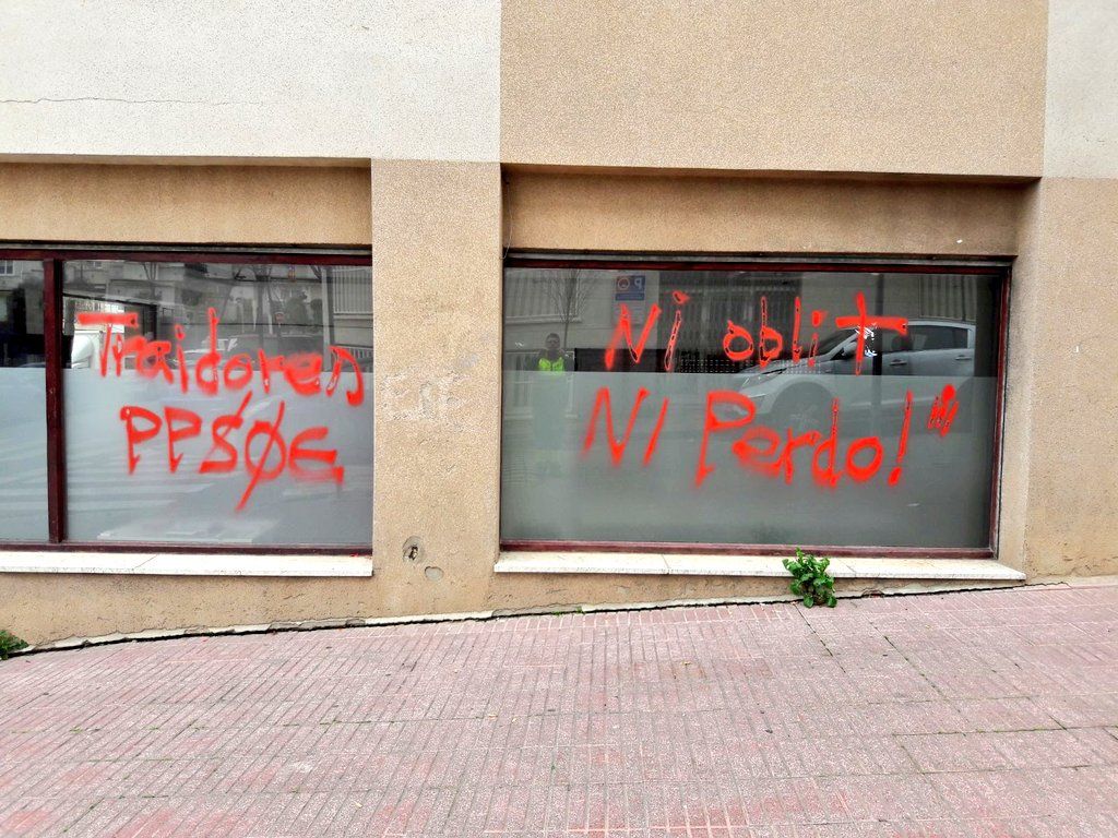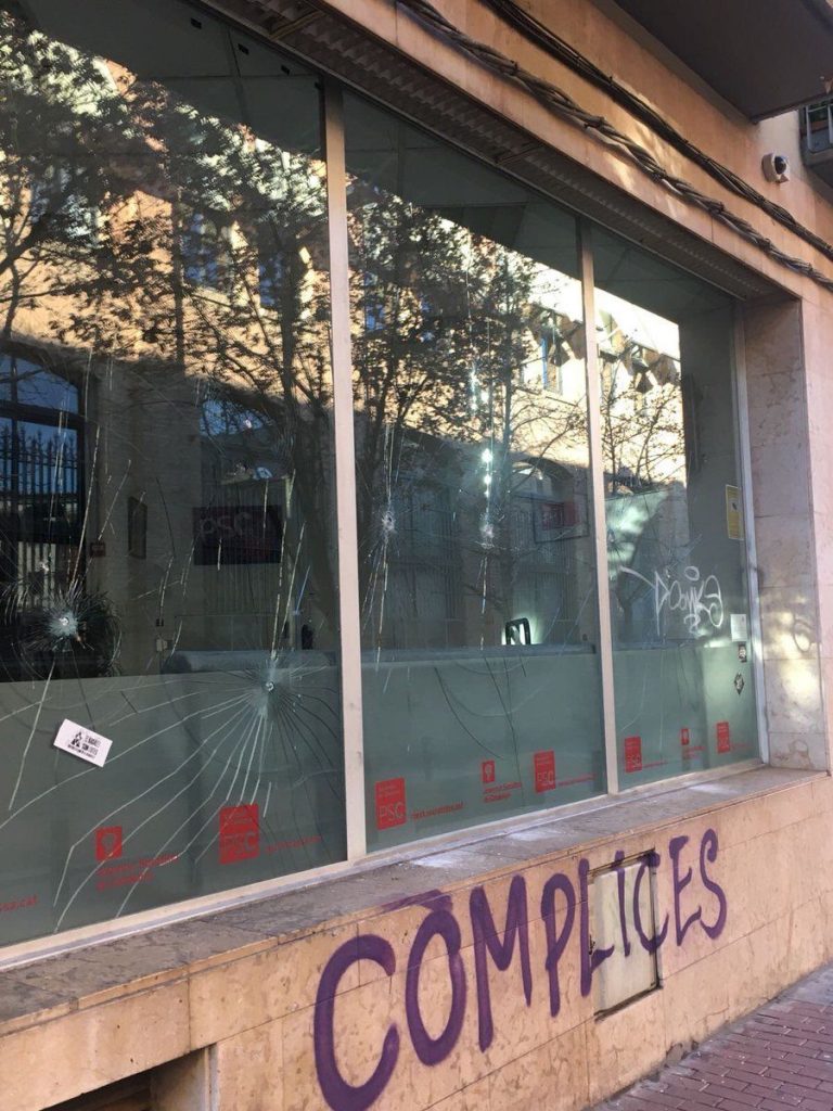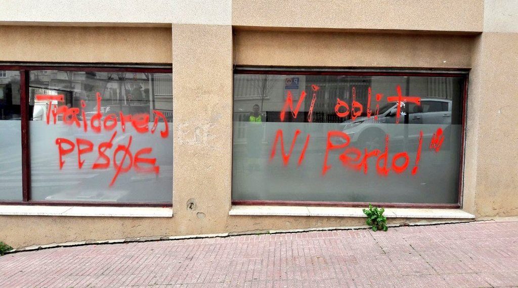 Y como no hay dos sin tres, la sede de los socialistas catalanes en Terrassa también ha sido vandalizada. Pintadas de «complices» y vidrios rotos por parte de ‘descontrolados’ que recuerdan a los comandos profascistas de los últimos años del franquismo.