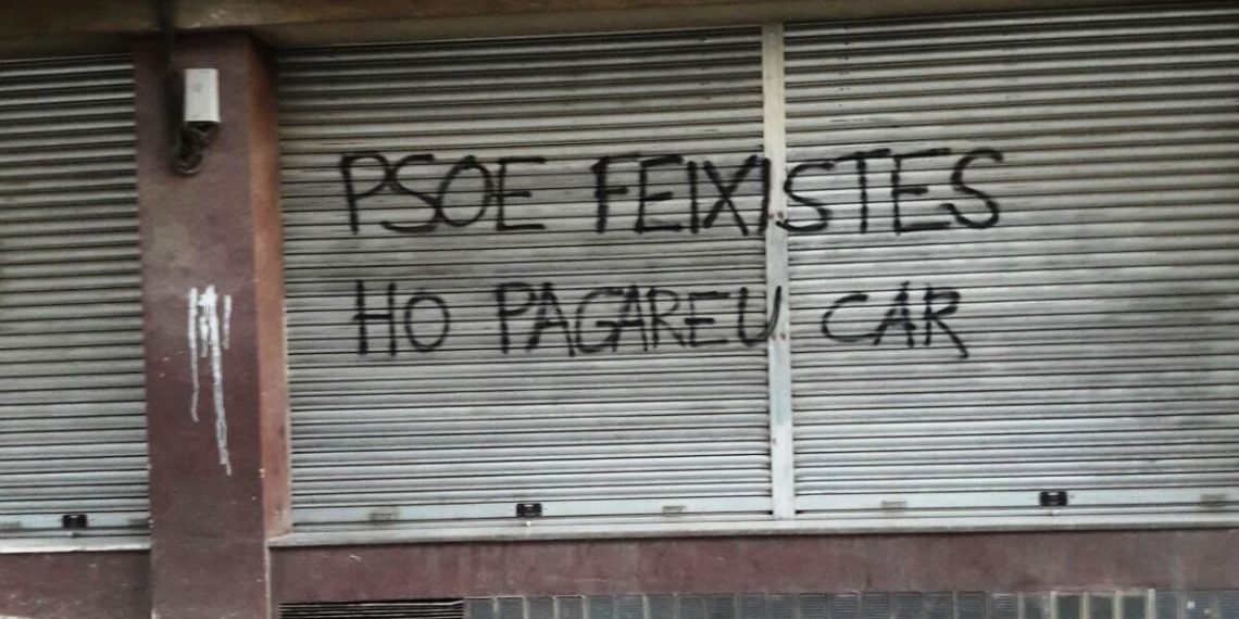 La sede del PSC en Berga, la capital de la comarca del Berguedà, ha sido atacada el viernes por unos radicales desconocidos que han pintado en el local el mensaje «PSOE fascistas, lo pagaréis caro». No ha sido el único local socialista que ha sufrido vandalismo, dado que el día anterior le tocó al de Solsona: lanzaron una piedra contra el cristal de la puerta principal.