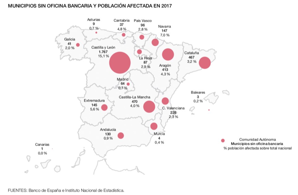 La ausencia de servicios financieros en el mundo rural es una consecuencia más del proceso de reducción demográfica -la llamada España vaciada- que viven algunas zonas de nuestro país y representa una amenaza real de exclusión de sistema bancario para la población. Según los últimos datos, más de 4.000 pueblos (es decir, alrededor de la mitad) no cuentan con una agencia bancaria, un problema que crece a medida que se reduce el número de habitantes: los pueblos con menos de 500 personas concentran el 85% de los municipios sin sucursal.