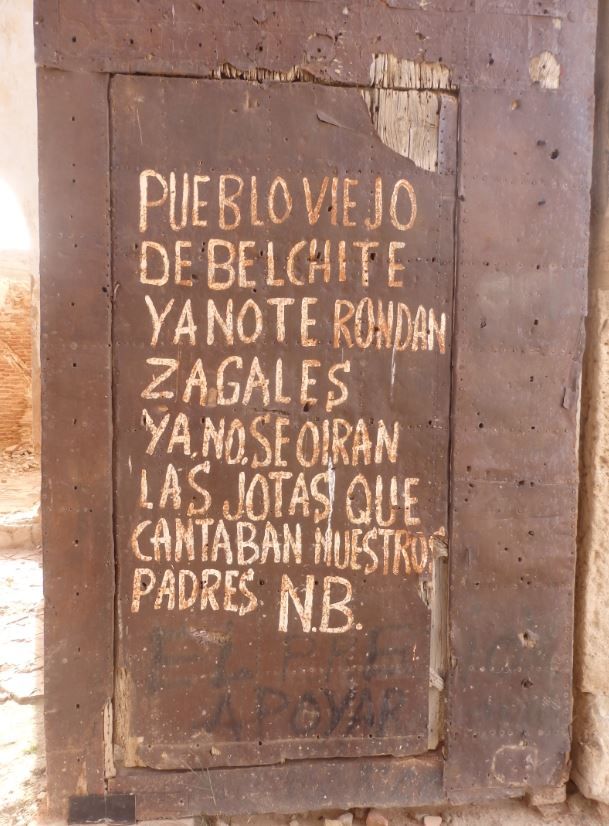 Natalio Baquero nacido en plena batalla en, un día en una visita con melancolía escribió en la puerta de la iglesia la letra para una jota: “Pueblo viejo de Belchite, ya no te rondan zagales, ya no se oirán las jotas que cantaban nuestros padres. NB”: