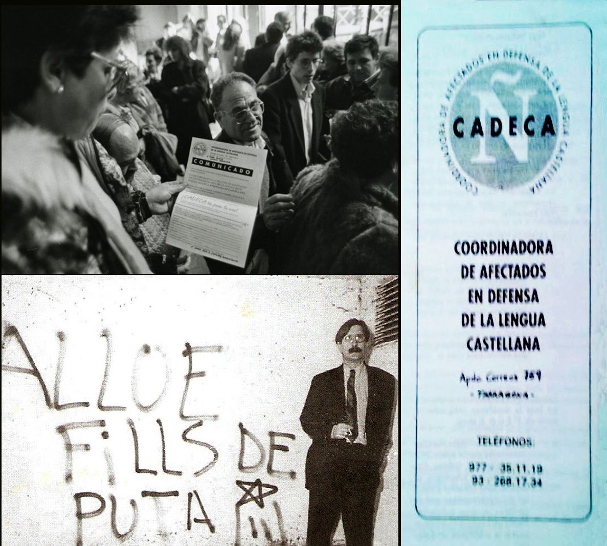 Me estoy refiriendo en primer lugar, a la Coordinadora de Afectados en Defensa del Castellano (Cadeca) que se creó en 1993 para luchar contra el modelo de inmersión lingüística escolar que se quiso imponer en Cataluña. Dicha entidad llegó a movilizar a varios cientos de personas y su origen está, sobre todo, en la lucha de algunas madres de dos colegios de Salou; siendo sus principales promotoras, Asunción García, que formaba parte del Consejo Escolar del colegio Santa María del Mar (que sería vicepresidenta de Cadeca y fue brutalmente agredida por miembros del independentismo radical) y Ángela Diest, en la escuela Europa (que sería posteriormente presidenta de la entidad).