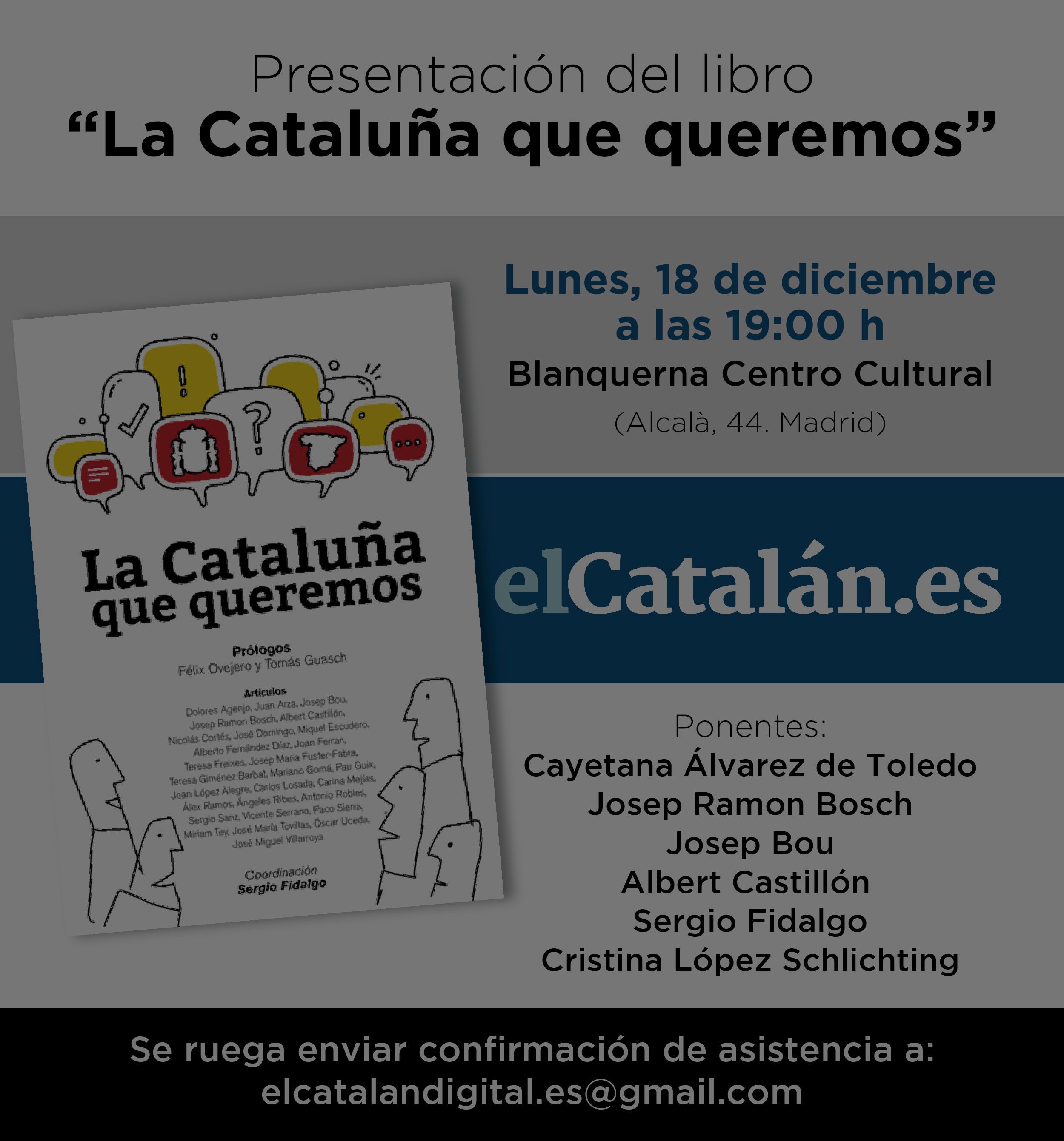 El próximo lunes, 18 de diciembre, a las 19:00 se presentará en Madrid el libro ‘La Cataluña que queremos’ (Ediciones Hildy), en la sede de la Generalitat de Catalunya en la capital, el Centro Cultural Blanquerna (Alcalà, 44). Los ponentes serán cuatro autores de la obra:
