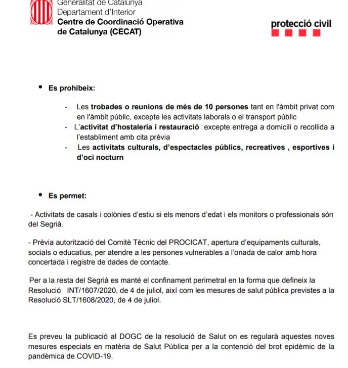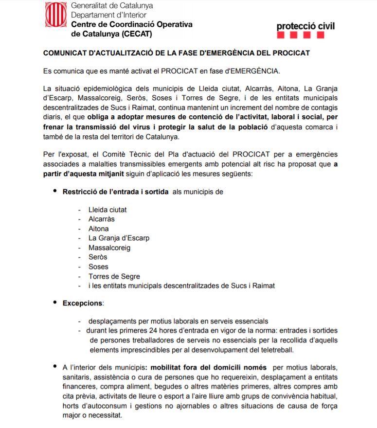 El Govern de la Generalitat ha dictado este domingo el confinamiento total en la ciudad de Lérida y otros siete municipios del Segrià, a causa del brote de COVID-19 descontrolado en esta comarca catalana.