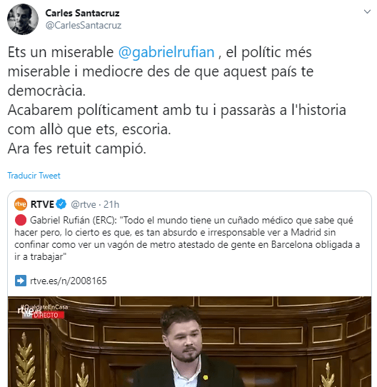 Para los separatistas más radicales los despiadados ataques de Rufián al Gobierno de España y el echarles los fallecidos de coronavirus a la cara le han parecido insuficientes. Y es que lanzó algún ‘recado’ a los ex convergentes, como el siguiente: «Espero que tras esta pandemia la derecha española y la catalana se lo piensen muy mucho antes de recortar en sanidad”.