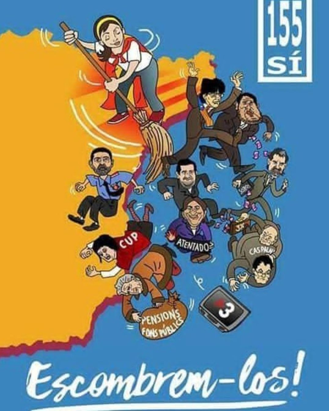 En las redes sociales está triunfando un cartel con los lemas «vamos a barrerlos» y «155 sí», y se ve a Josep Lluís Trapero, Oriol Junqueras, Carles Puigdemont y otros líderes secesionistas. Es una sátira de una campaña que hizo la CUP de cara a la consulta ilegal del 1 de octubre.