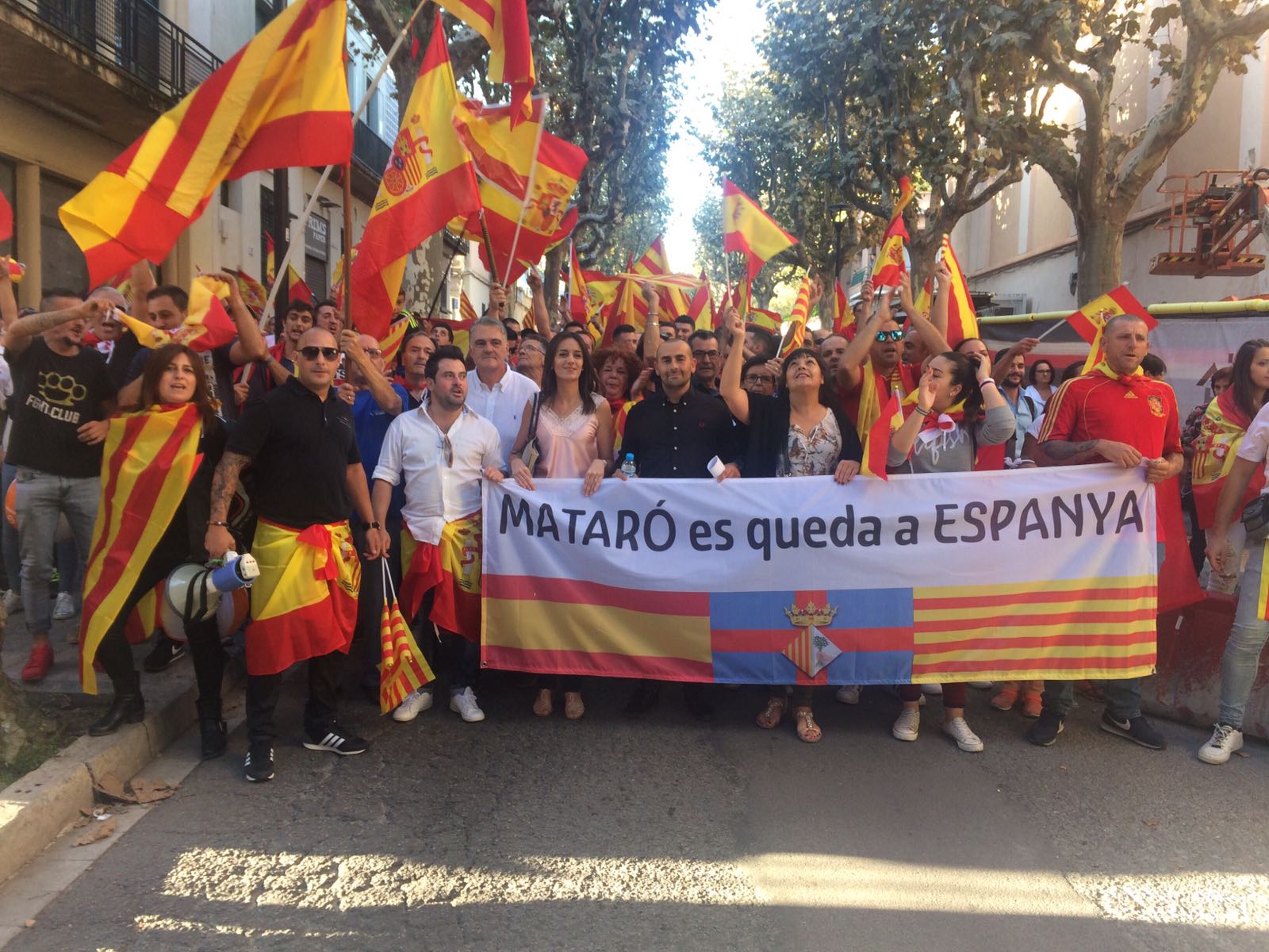 Centenares de catalanes (sobre setecientos o ochocientos, según las fuentes) han desfilado el sábado por la tarde por las calles de Mataró, localidad cercana a Barcelona, cantando el «Viva España» de Manolo Escobar y con banderas rojigualdas. La pancarta principal de la marcha tenía el lema «Mataró es queda a Espanya» [Mataró se queda en España].