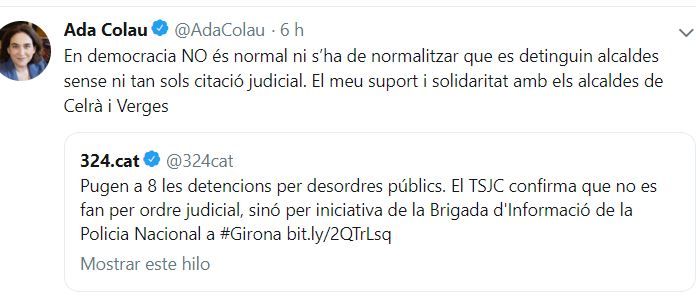 Colau ha valorado también en redes sociales que «en democracia no es normal ni se ha de normalizar que se detengan alcaldes sin tan solo citación judicial».