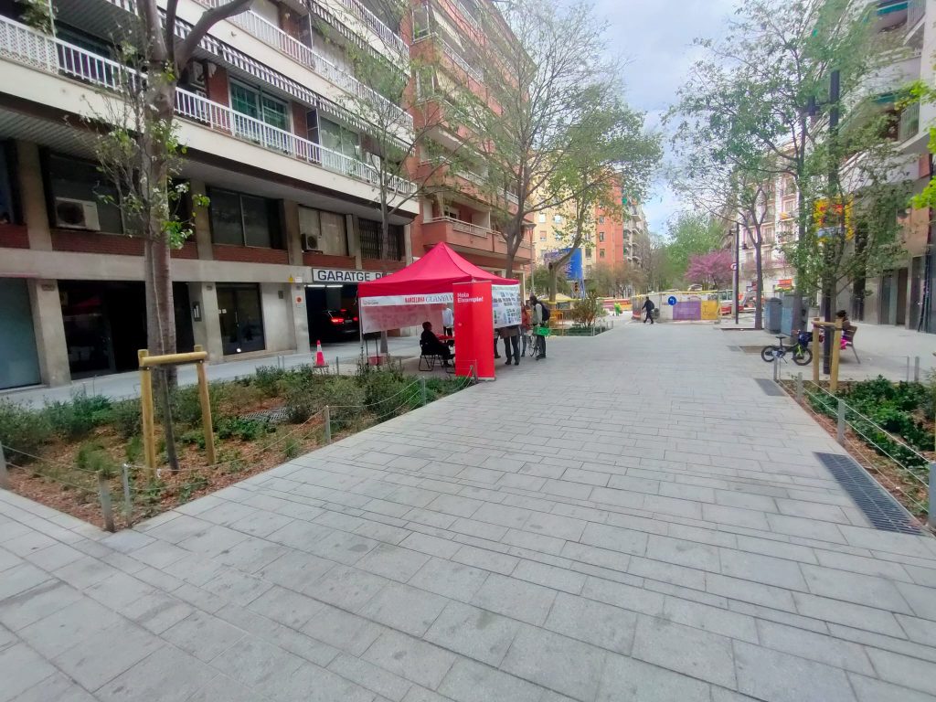 Unos días después las obras han avanzado mucho y están casi finalizadas en algunos sectores, y el pasado viernes 14 de abril los ‘comunes’ de Colau se apuntaron rápido a intentar rentabilizarla e instalaron una carpa de Barcelona en Comú en medio de la Superilla de Rocafort/Consejo de ciento.