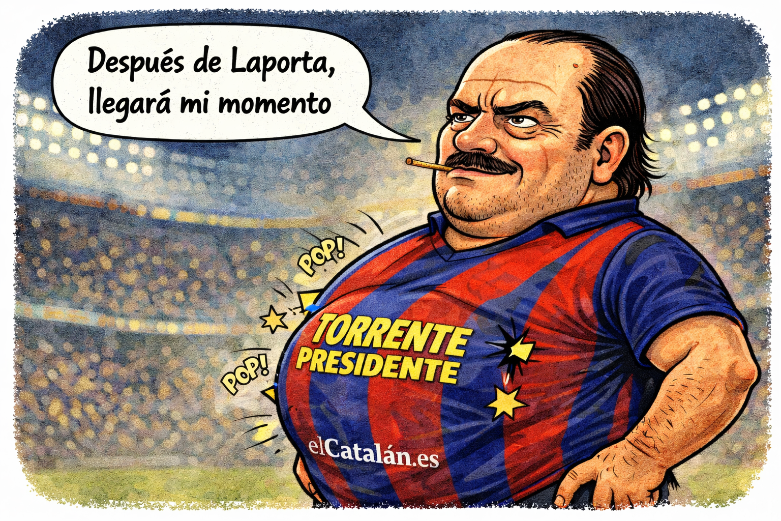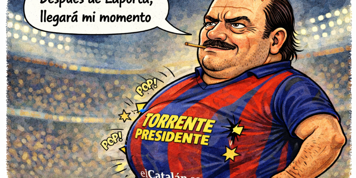El 30 de junio comenzará el último mandato de Joan Laporta y se iniciará la pugna por suceder al actual presidente de corte populista, uno de los más polémicos del fútbol español (dibujo: ChatGPT. Guion: S.F).