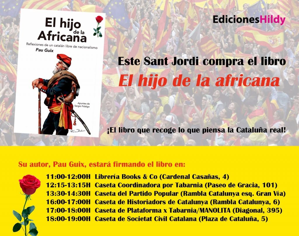 Quién desee conseguir las dos últimas novedades de Ediciones Hildy, ‘El hijo de la Africana’, de Pau Guix y ‘Usted puede salvar España’, de Sergio Fidalgo, en Sant Jordi, puede pasarse por los puestos por los que estos autores firmarán en esta jornada cultural.