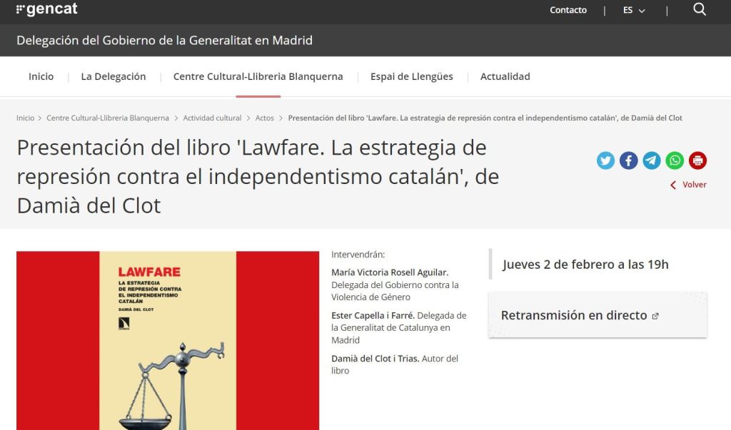 Estamos indignados con esta actitud, sobre todo porque la delegada de la Generalitat en Madrid, Ester Capella, presentó el 2 de febrero, en la Blanquerna, un libro elogioso con el ‘procés’: ‘Lawfare. La estrategia de represión contra el independentismo catalán”. Su autor es Damià del Clot, alcalde de Vilassar de Mar por ERC.