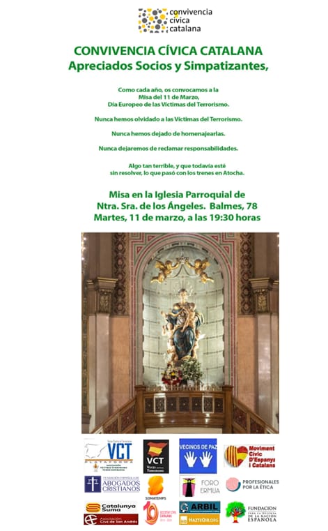 Y recuerdan que «algo tan terrible» como la matanza del 11-M «todavía está sin resolver». La misa se celebrará en la Iglesia Parroquial de Nuestra Señora de los Ángeles (Balmes, 78. Barcelona). Comenzará a las 19:30. El presidente de Convivencia Cívica Catalana es Ángel Escolano.