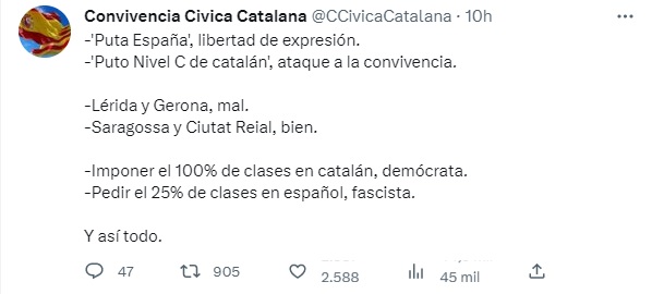 En la comunidad autónoma catalana algún tratan de torcer la realidad hasta ver como algo normal que se insulte a España, o a cualquier persona que no defienda las tesis independentistas y ver como un ataque feroz contra Cataluña que se critiquen las imposiciones lingüísticas que tratan de imponer el catalán cueste lo que cueste. Todo ello lo hacen bien regado con el dinero de todos los catalanes.