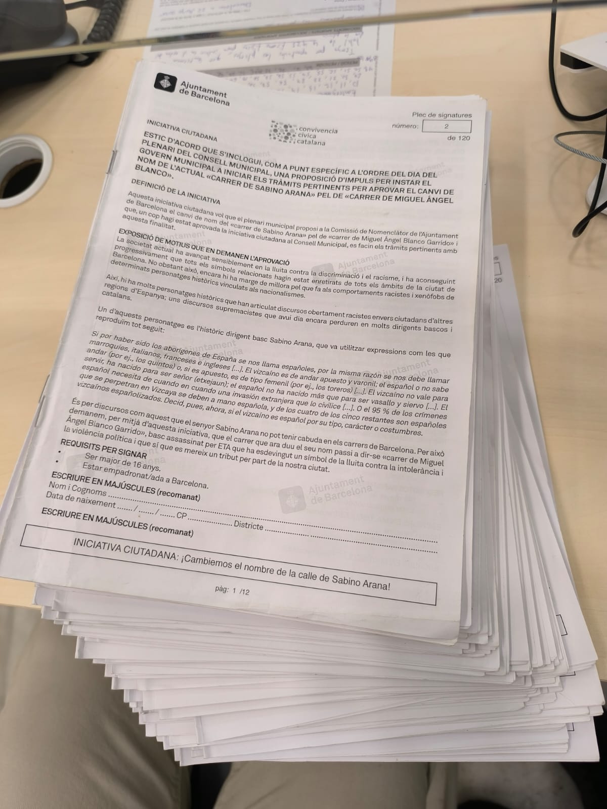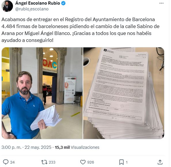 «Acabamos de entregar en el Registro del Ayuntamiento de Barcelona 4.484 firmas de barceloneses pidiendo el cambio de la calle Sabino de Arana por Miguel Ángel Blanco. ¡Gracias a todos los que nos habéis ayudado a conseguirlo!».