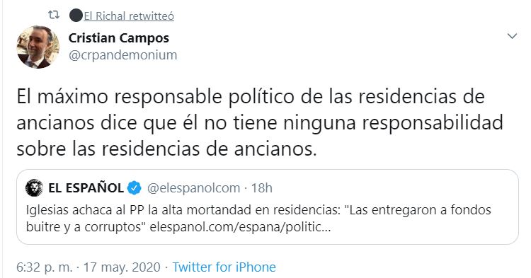 Y Campos comentó esta noticia y definió la actitud de Iglesias como gobernante en una sola frase: «El máximo responsable político de las residencias de ancianos dice que él no tiene ninguna responsabilidad sobre las residencias de ancianos».