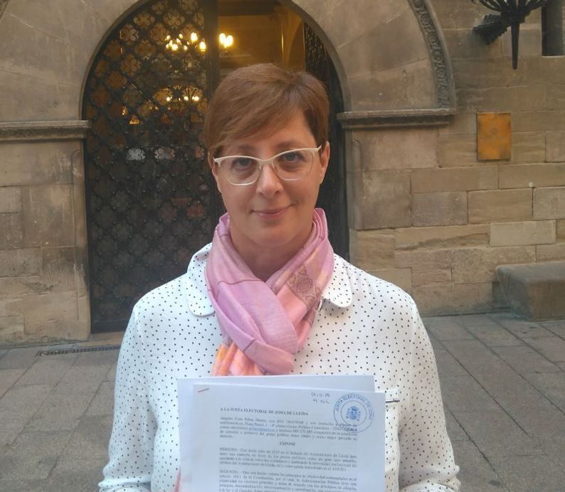 La portavoz del grupo de Ciudadanos en el Ayuntamiento de Lleida, Ángeles Ribes, ha denunciado esta mañana a la Paeria ante la Junta Electoral de Zona por la pancarta y los lazos que se exponen en la fachada del Ayuntamiento. Ribes ha manifestado que “las instituciones y administraciones deben mantenerse neutrales a de cara a los ciudadanos, ya que les sirven y prestan servicios con independencia de la ideología que tengan.