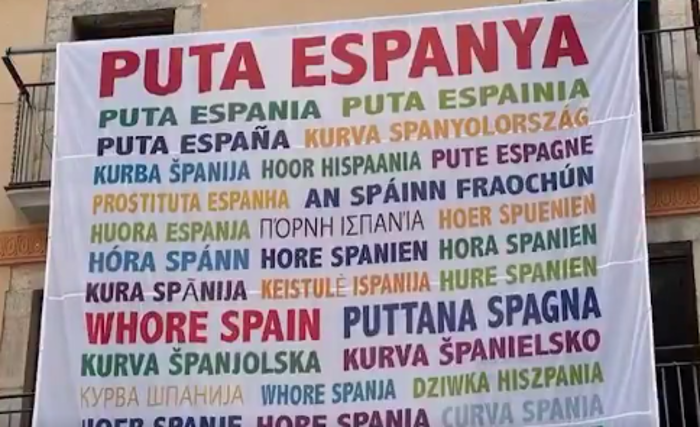 Tenemos un nuevo ejemplo. En el pueblo del prófugo Carles Puigdemont un grupo de vecinos ha colgado una gigantesca pancarta en la plaza principal de Amer en la que se puede leer “Puta España” en todos los idiomas posibles. Un gesto inequívoco de buen rollo de los separatistas, siempre tan dispuestos a favorecer la convivencia. Entiéndase la ironía.