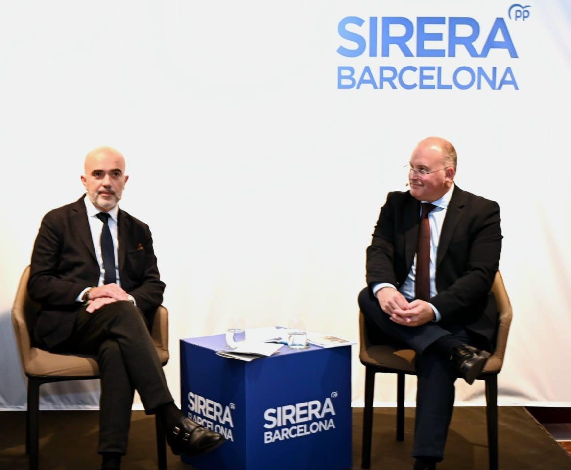 El portavoz del PP en el Congreso de los Diputados, Miguel Tellado, ha dado una charla en el Círculo Ecuestre, en Barcelona, junto a Daniel Sirera, presidente del grupo municipal de esta formación en la capital catalana.