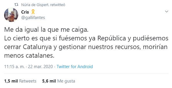 Esta teoría, siguiendo la lógica de esta tuitera, implica que como la respuesta a la actual crisis sanitaria provocada por el Covid-19 está gestionada por el Gobierno de España, mueren más catalanes.
