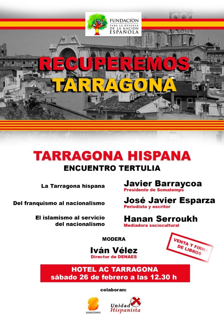 La Fundación para la Defensa de la Nación Española (DENAES) organizará, junto a Somatemps y Unidad HIspanista, un acto dedicado a la «Tarragona Hispana», con el lema «Recuperemos Tarragona». Será el sábado 26 de febrero a las 12:30 en el Hotel AC Tarragona.