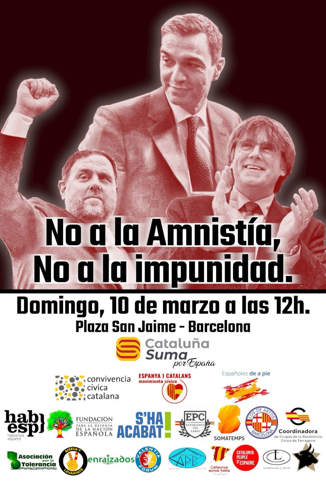 La Resistencia al separatismo ha convocado a los catalanes este domingo a las 12:00 en la barcelonesa plaza de Sant Jaume (metro L3 Liceu y L4 Jaume I. Rodalies Pl. de Cataluña. FGC Pl. de Cataluña) bajo el lema «no a la amnistía, no a la impunidad», y con un cartel que contiene las imágenes de Pedro Sánchez, Oriol Junqueras y Carles Puigdemont. VOX, PP y Ciudadanos estarán presentes y apoyan esta manifestación.