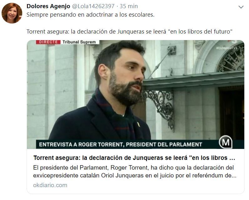 Doiores Agenjo ha comentado en su perfil personal de Twitter que Roger Torrent está «siempre pensando en adoctrinar a los escolares».
