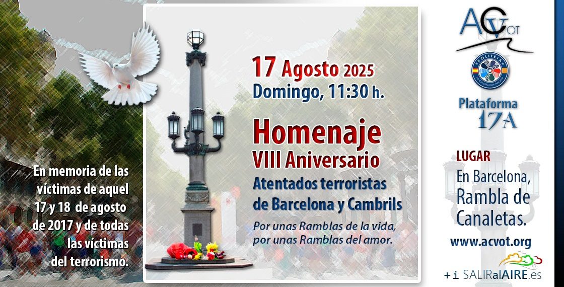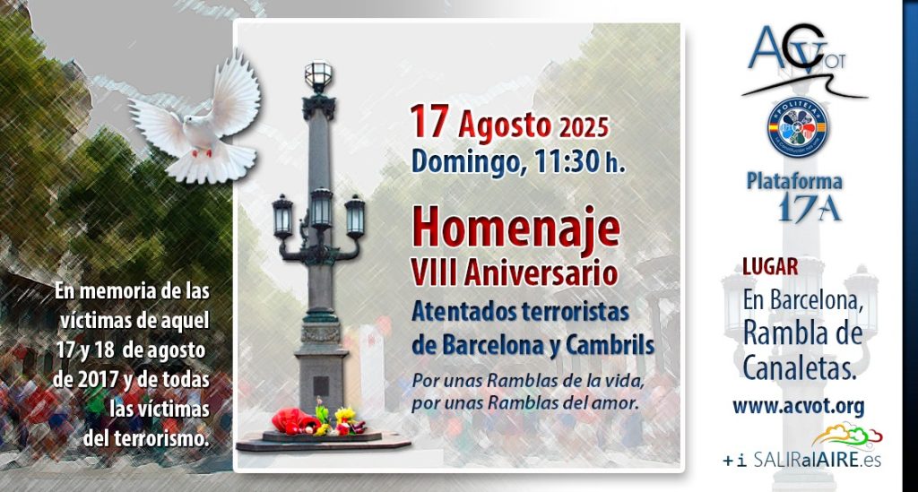 La ACVOT, Politeia y la Plataforma 17-A organizan el próximo 17 de agosto a las 11:30 un sentido acto de homenaje a las víctimas del terrorismo de los sangrientos atentados de las Ramblas y Cambrils, y a las víctimas de atentados en general.