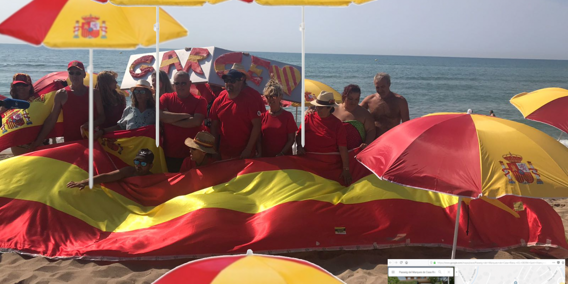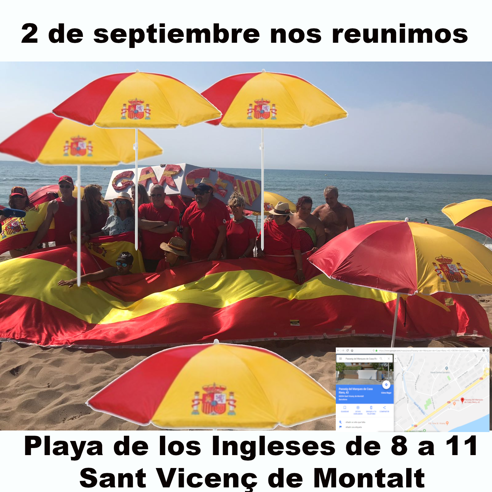 Está circulando en redes sociales un meme en el que se invita a acudir aun concentración el próximo 2 de septiembre a la Playa de los Ingleses, en Sant Vicenç de Montalt, de 8:00 a 11:00 de la mañana, con sombrillas rojigualdas. En la imagen se ve el logo de la entidad que convoca, GARCE.