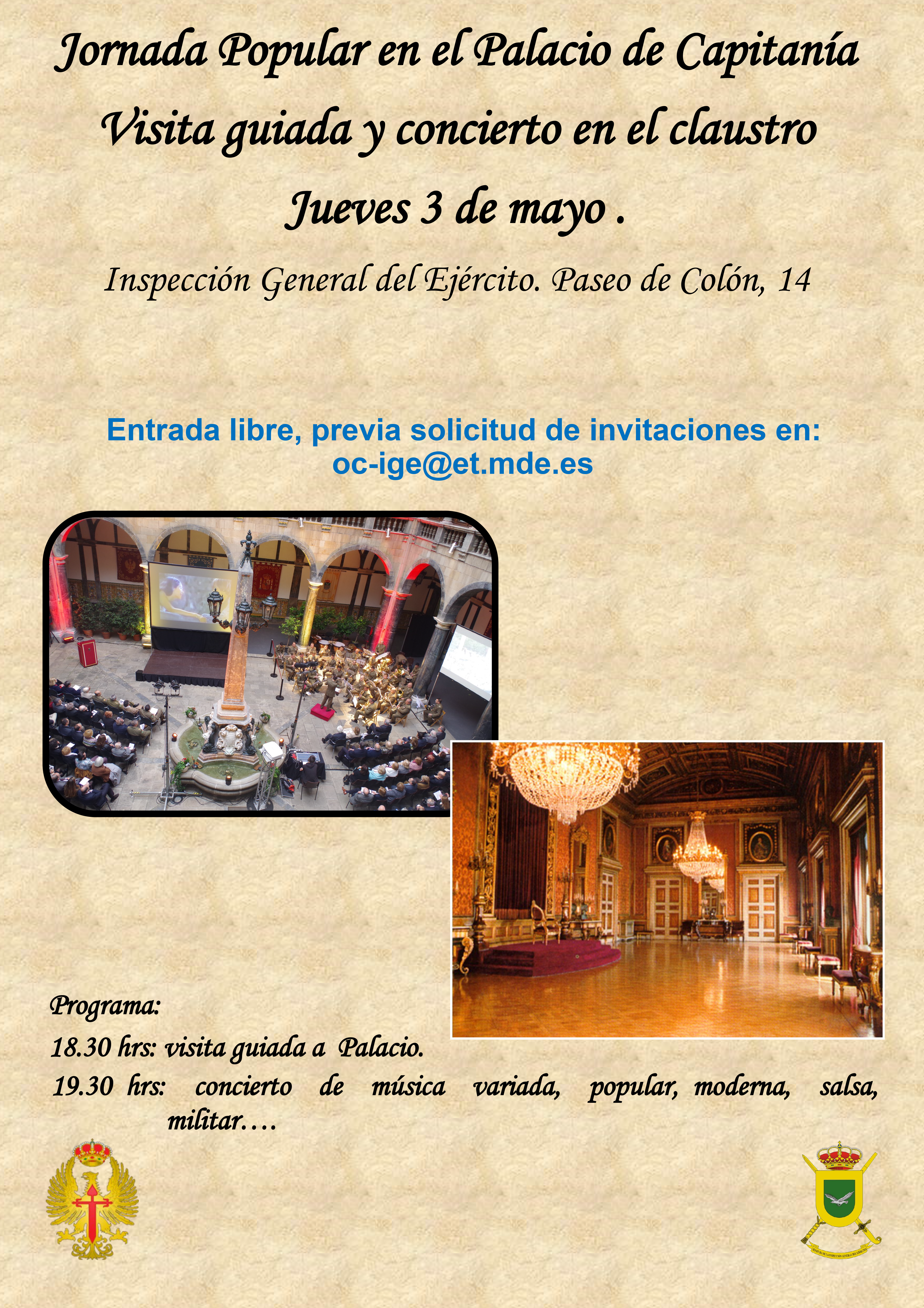 El próximo día 3 de mayo la Inspección General del Ejército organiza en Capitanía (Paseo de Colón, 14) una jornada que consiste en una visita guiada a la planta noble del Palacio, a partir de las 18.30 horas, seguida de un concierto en el claustro, a las 19.30 horas.